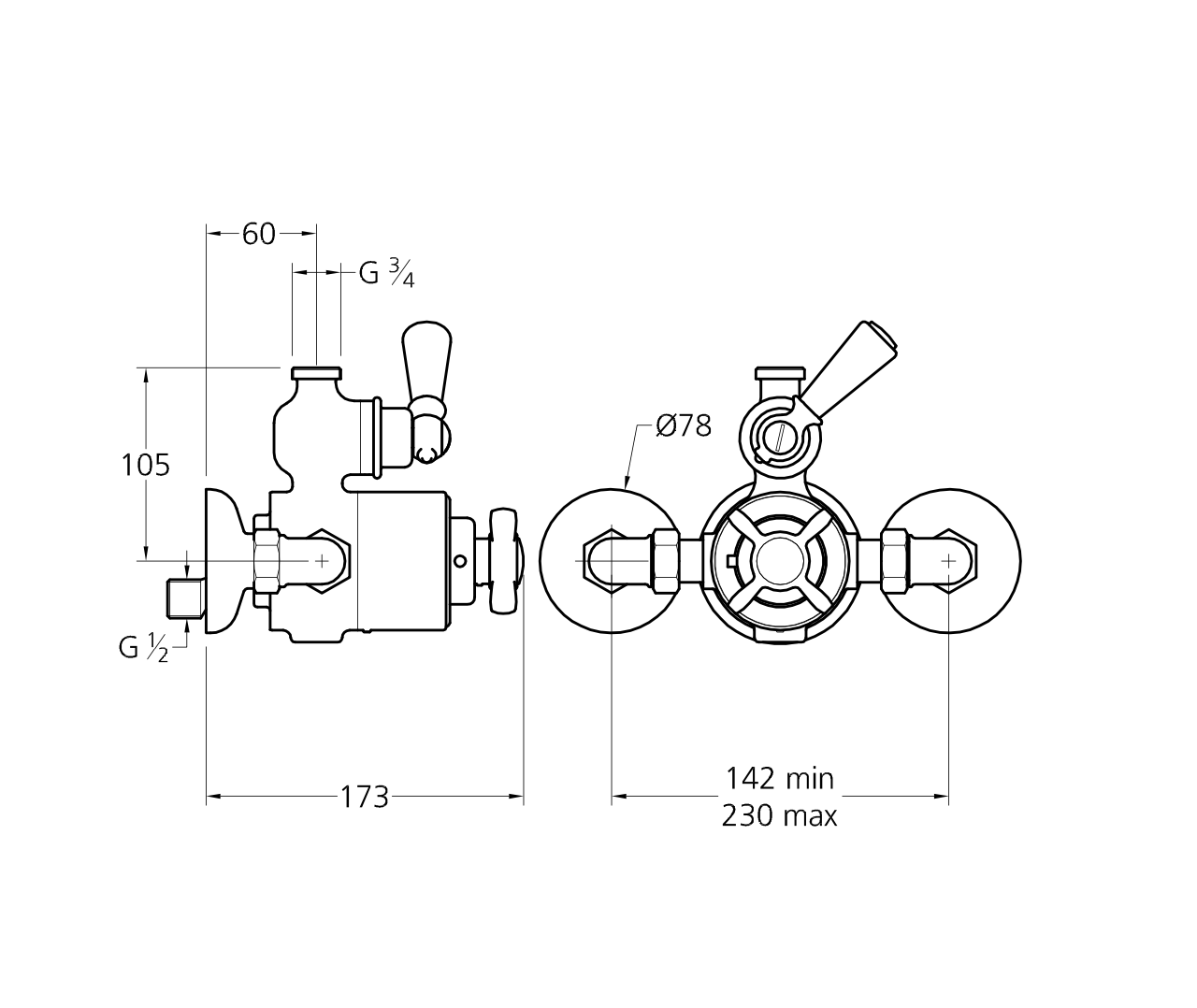 Aufputz Duschthermostat mit Absperrventil mit Rückführungsbogen (Thermostatblock oben)
