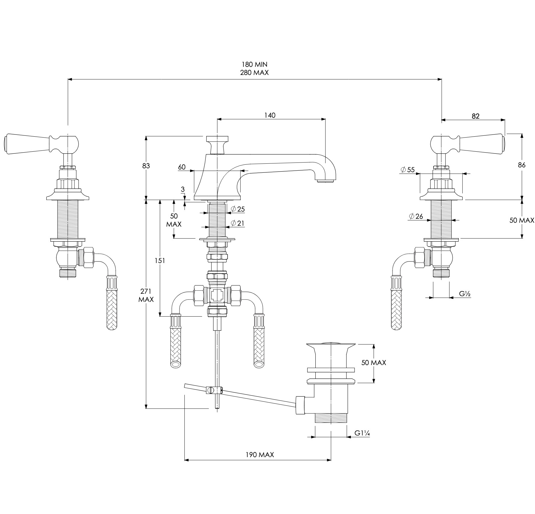 LB1930 Mackintosh 3-Loch Waschtisch-Armatur mit Hebelgriffen schwarz BL-1228