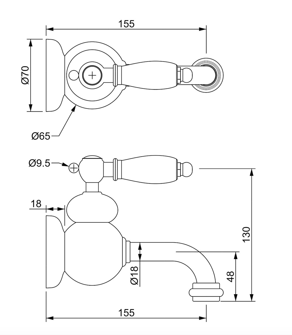 Wandmontierte Waschtischarmatur mit Porzelan Hebelgriff weiss oder schwarz