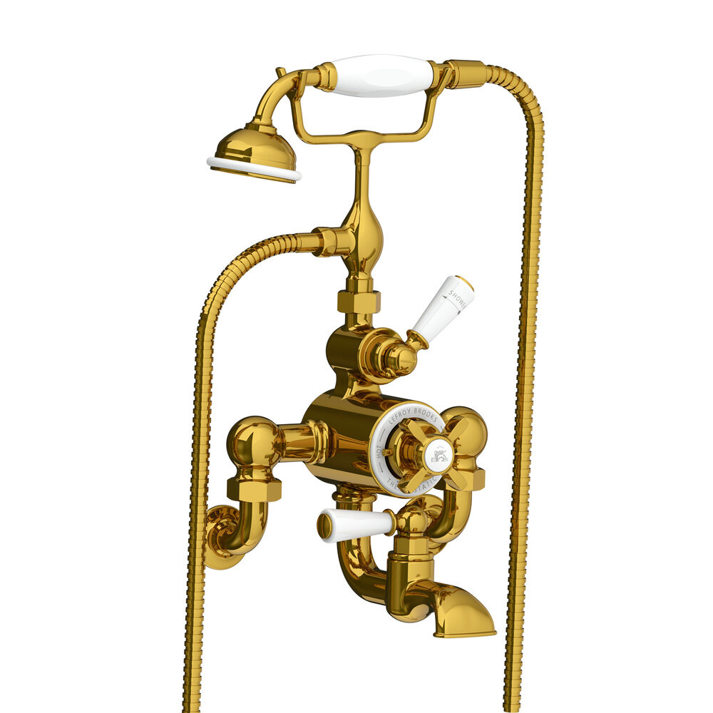 Wall mounted thermostatic bath shower mixer with white porcelain levers. EU spec with eccentric wall connections