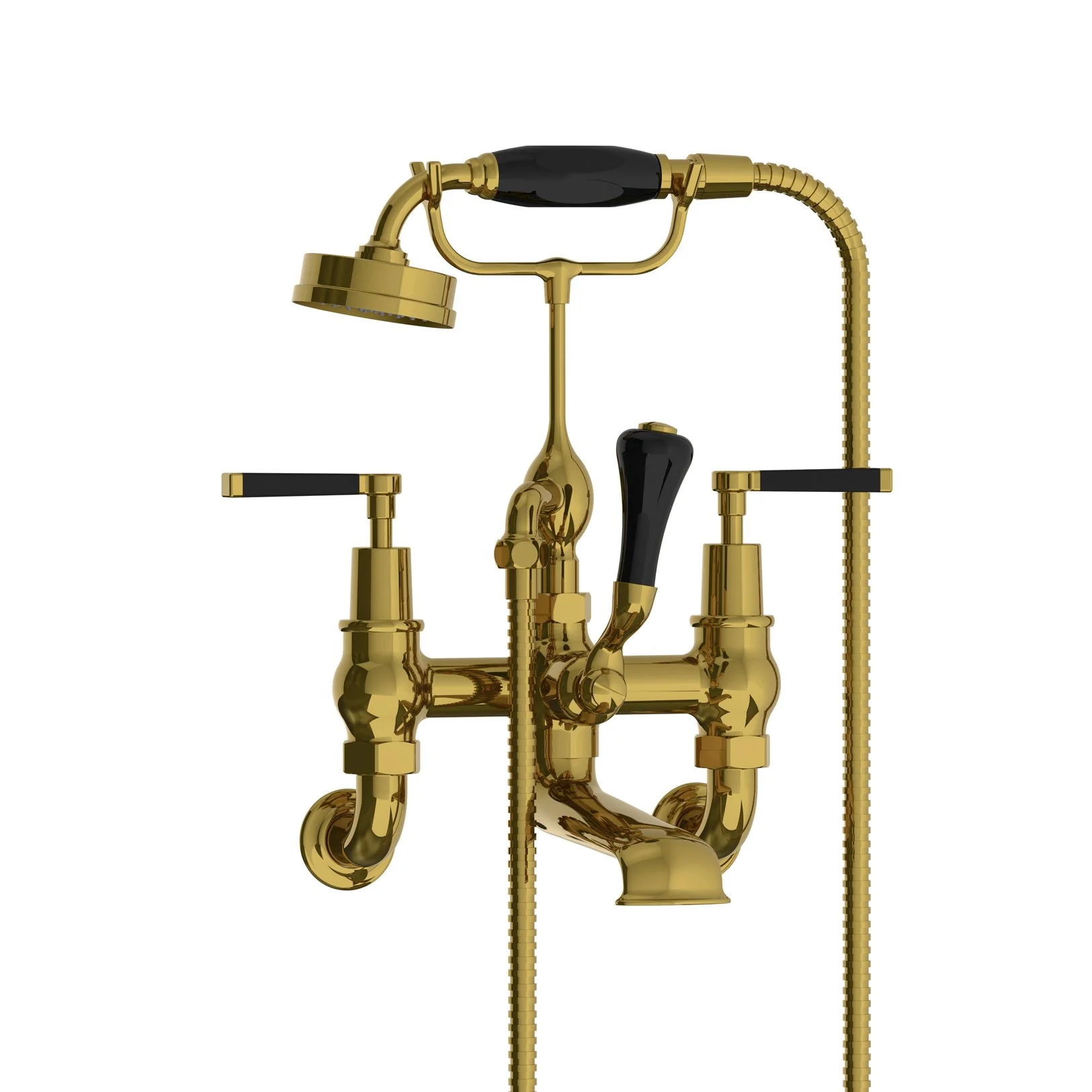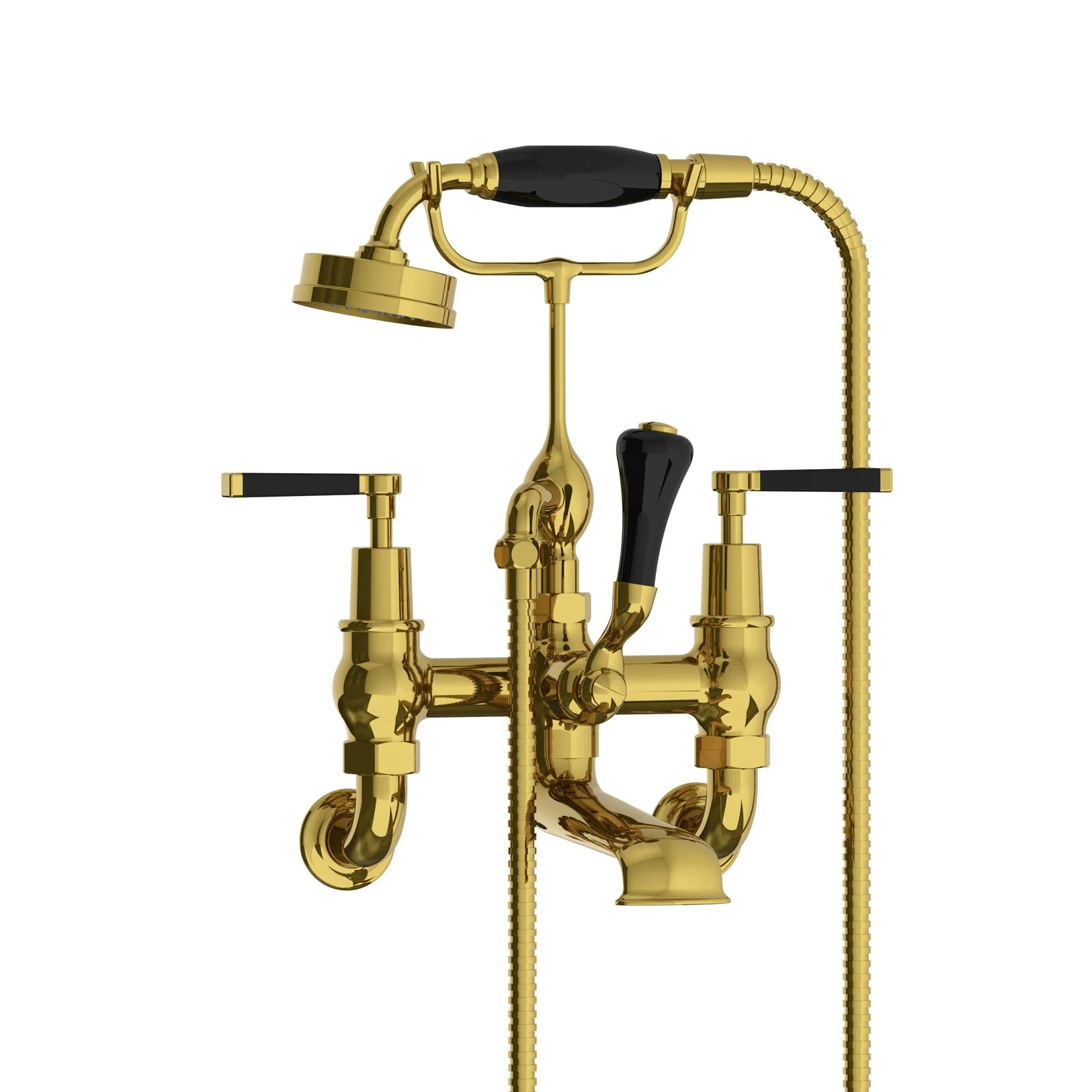 Wall mounted bath shower mixer with lever handles and black porcelain accent; easy clean shower rose
