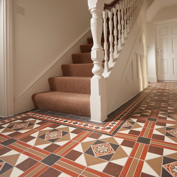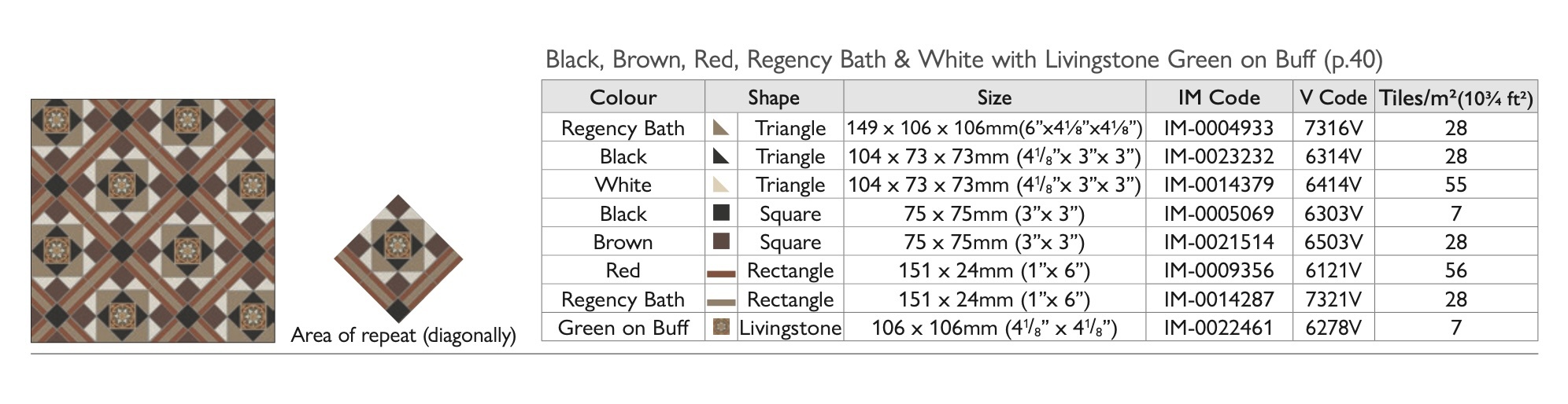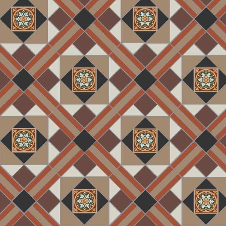 OS Victorian Floor floor tiles - Pattern Lindisfarne (Black, Brown, Red, Regency Bath, White & Livingstone Green on Buff)