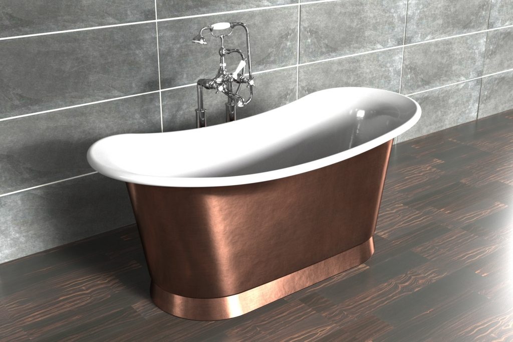 Freestanding copper bath with exterior brushed copper and interior white enamel