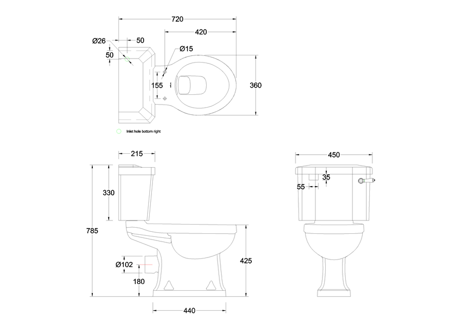 Duoblok toilet met porseleinen hendel, achteruitlaat (PK), toiletpot zonder spoelrand