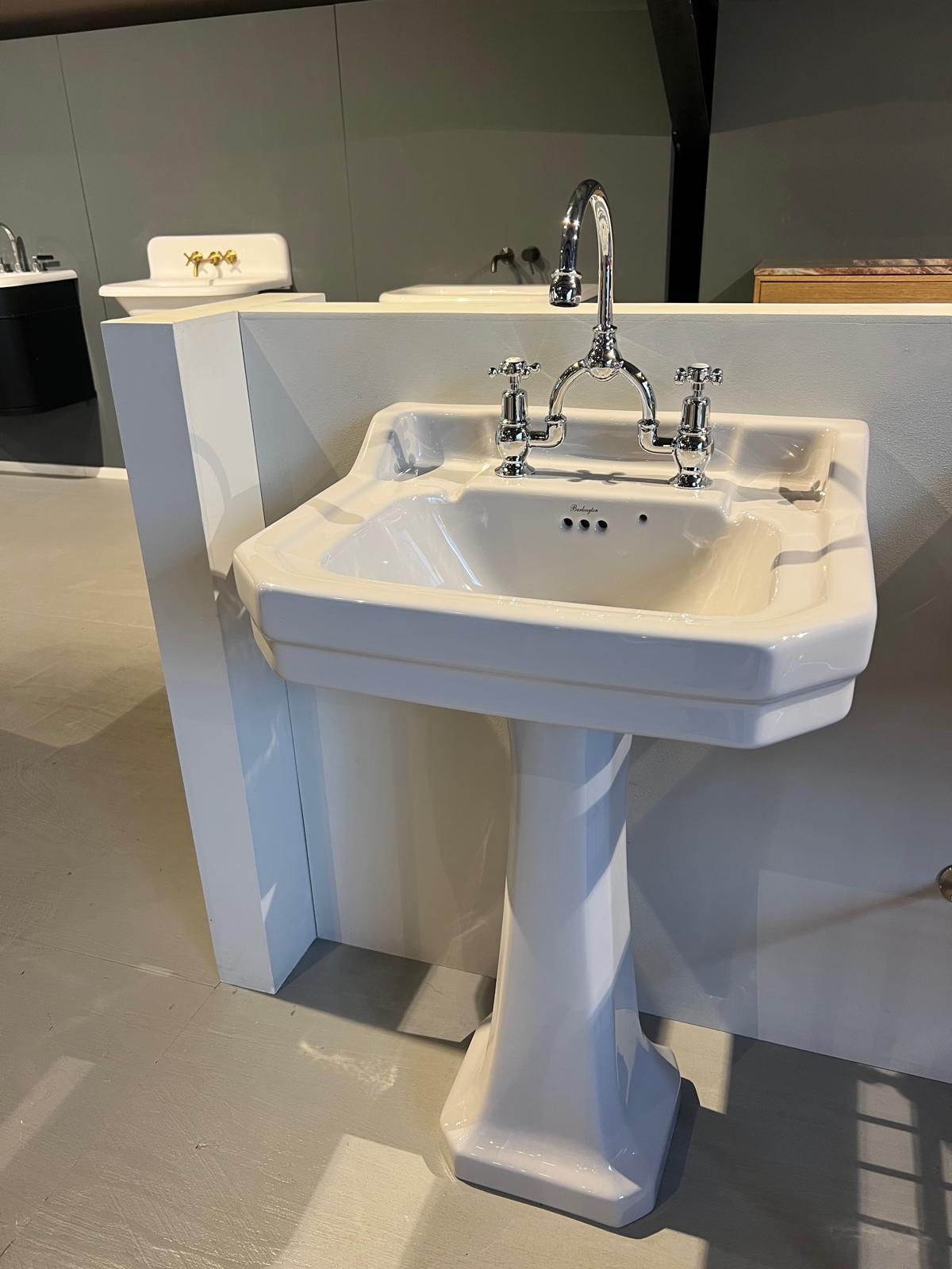 Klassieke medium wastafel Edwardian 56cm met zuil (P1), 2 kraangaten - met wastafelkraan CL27.CHR & W11.CHR afvoer