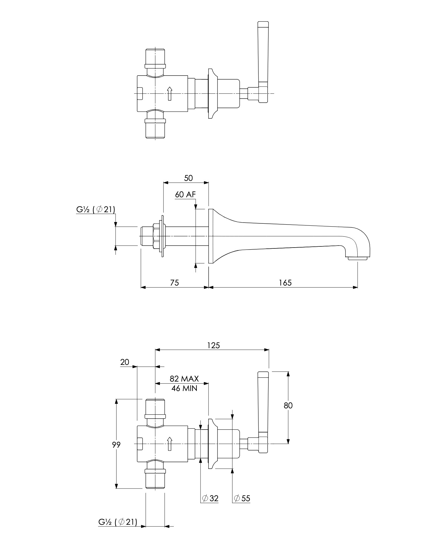 LB1930 Mackintosh 3-gats wastafelkraan met hendel, wandmontage MB-1200