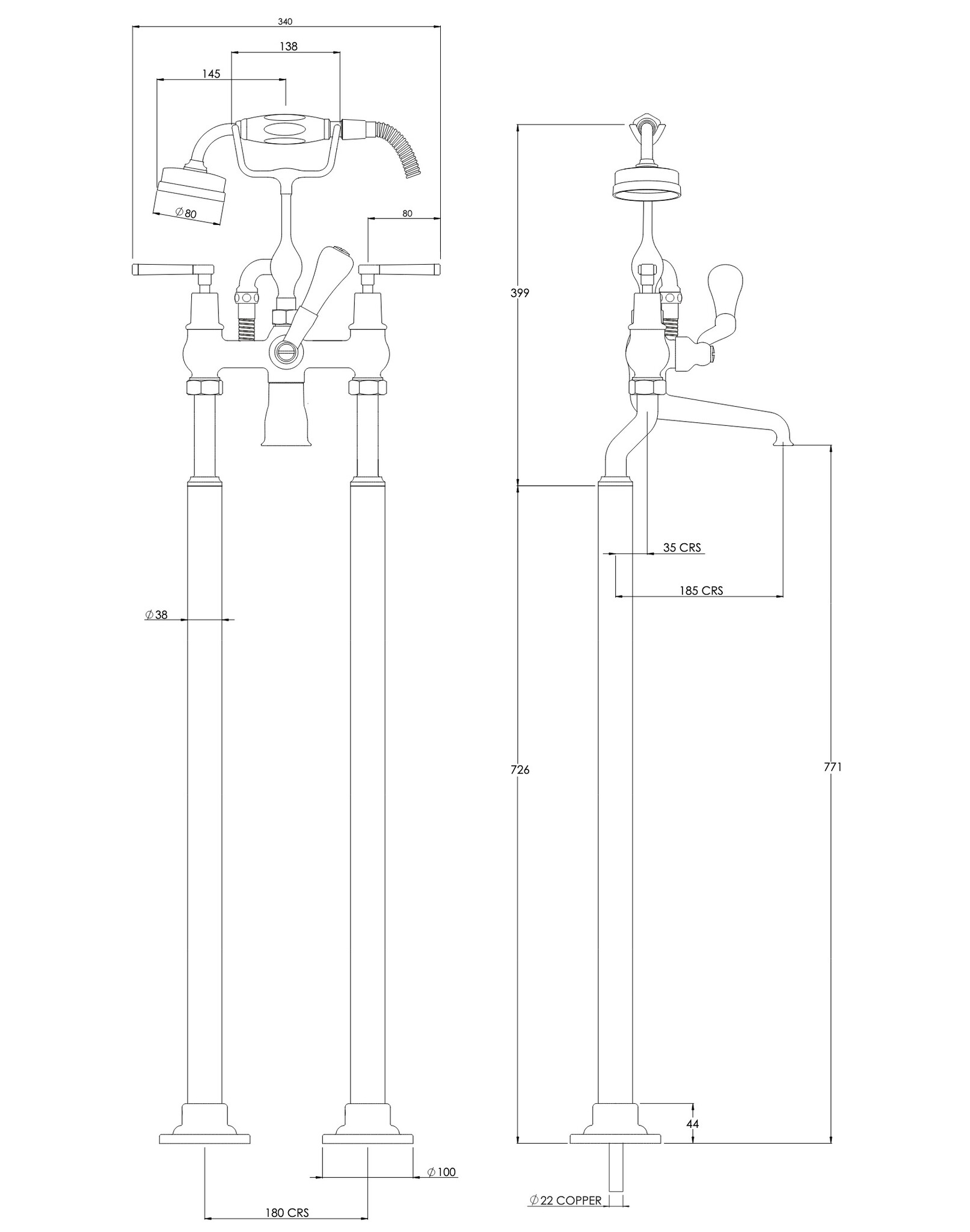 LB1930 Mackintosh vrijstaande badmengkraan met handdouche en vloer aansluitpoten MB-1144