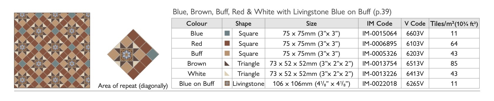 OS Victorian Floor vloertegels - Pattern Blenheim (Blue, Brown, Buff, Red, White & Livingston Blue on Buff)