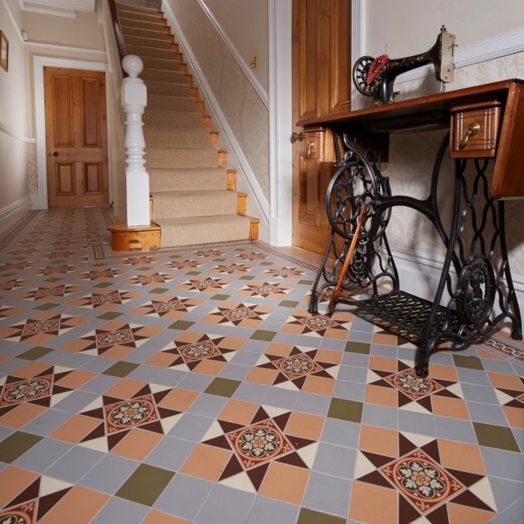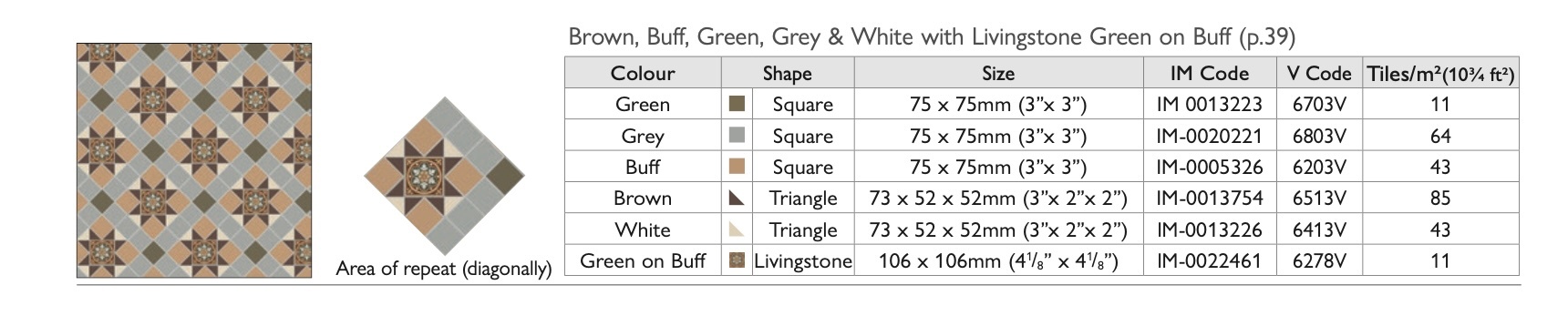 OS Victorian Floor vloertegels - Pattern Blenheim (Brown, Buff, Green, Grey, White & Livingstone Green on Buff)