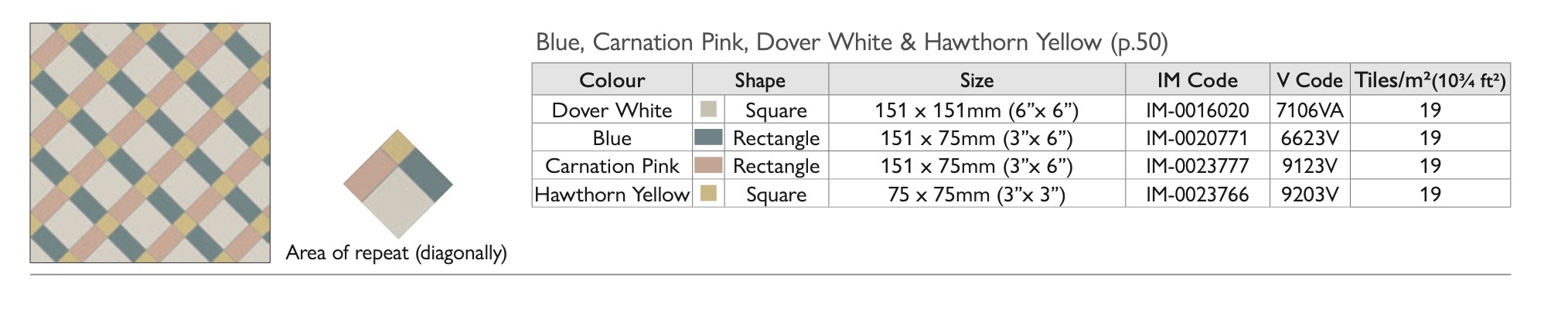 OS Victorian Floor vloertegels - Pattern Falkirk (Blue, Carnation Pink, Dover White & Hawthorn Yellow)